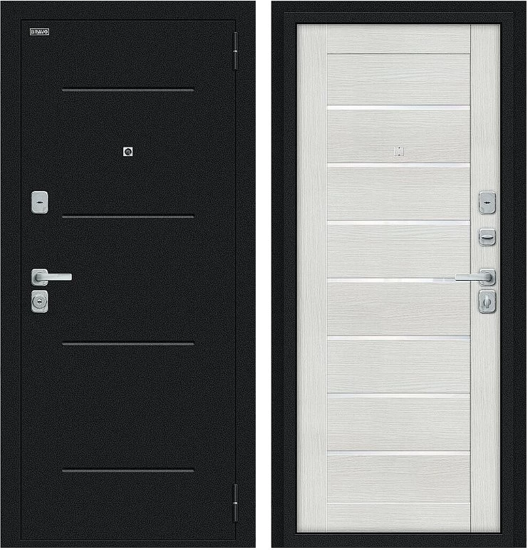 Надежная входная Дверь Браво Техно/BChrome Букле черное/Bianco Melinga премиум класса по цене 35 131 руб. Большая толщина стали защитит от проникновения в ваш дом, квартиру или коттедж. Используется очень качественная фурнитура: замки, цилиндры, ручки, защелки. Покрытие и отделка двери изготовлено под внимательным контролем производителя. Дверь имеет долгий срок службы и гарантию.